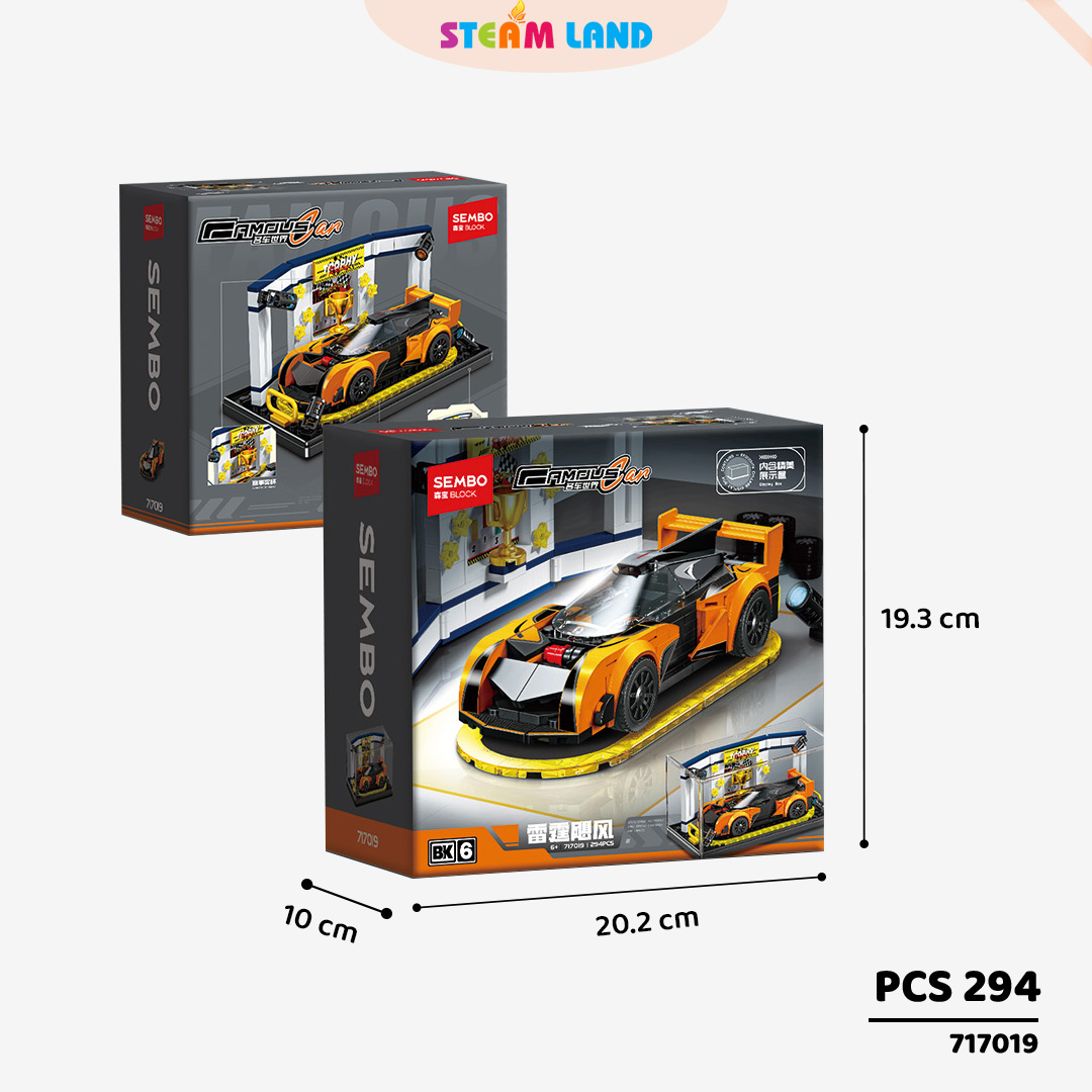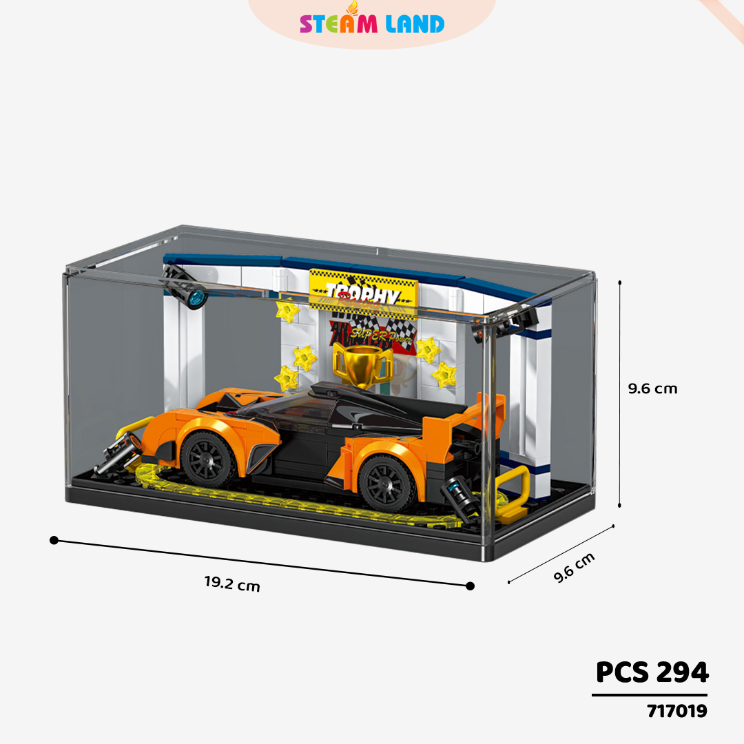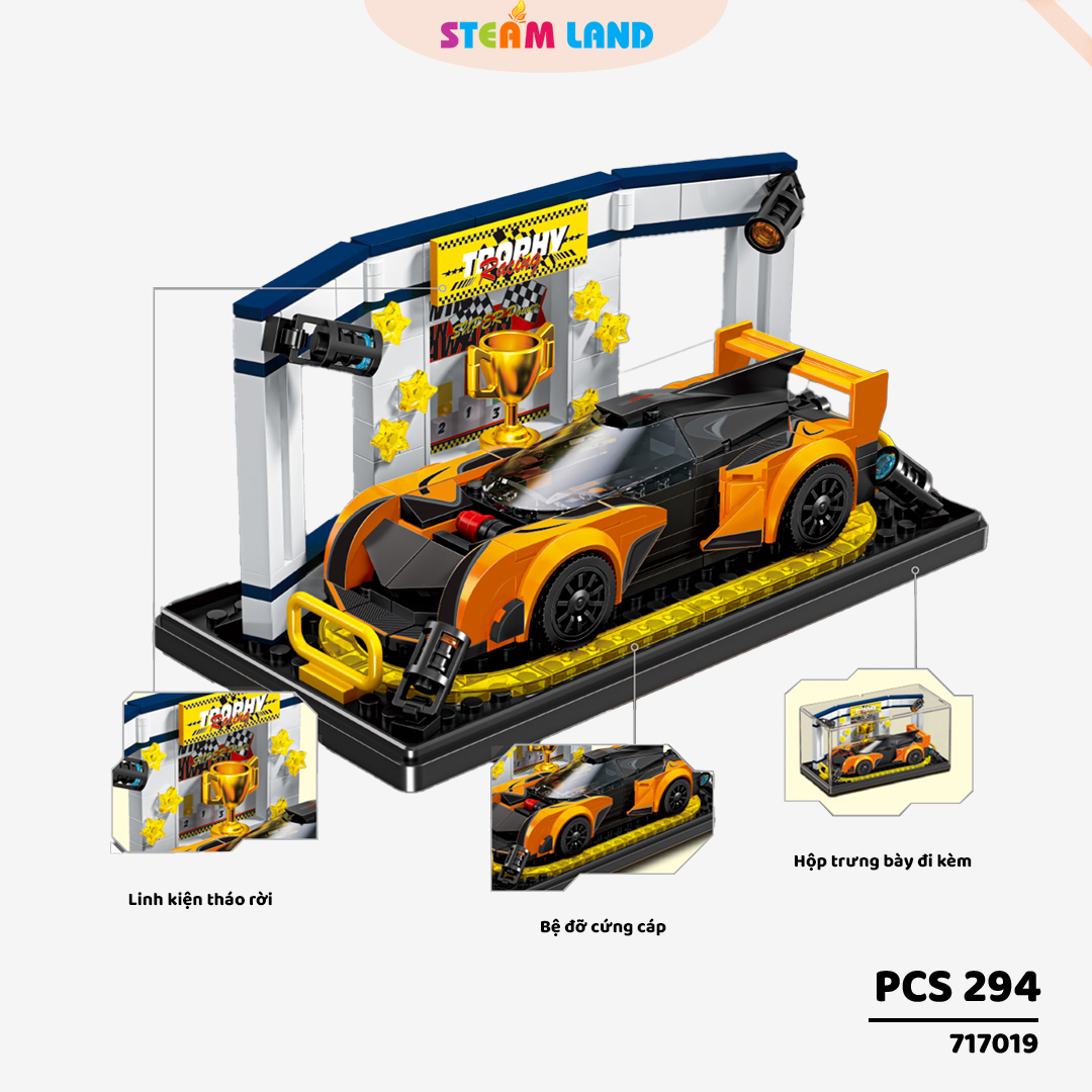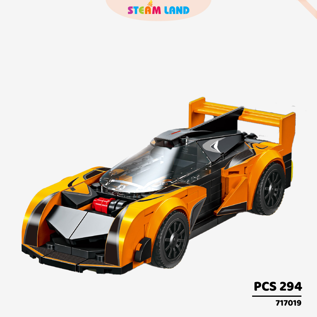 Chiếc xe đua lắp ráp mang thiết kế thể thao siêu ngầu với tông cam – đen nổi bật. Mô hình sở hữu cánh gió lớn, khung gầm thấp, buồng lái trong suốt và chi tiết động cơ tinh xảo,