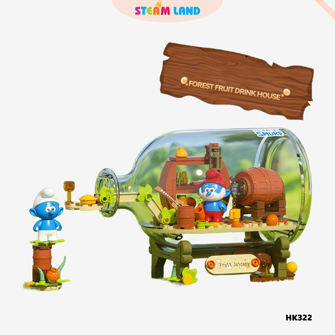 Xưởng nước ép mini đầy màu sắc, có trái cây, máy ép và hiệu ứng không gian vui tươi.