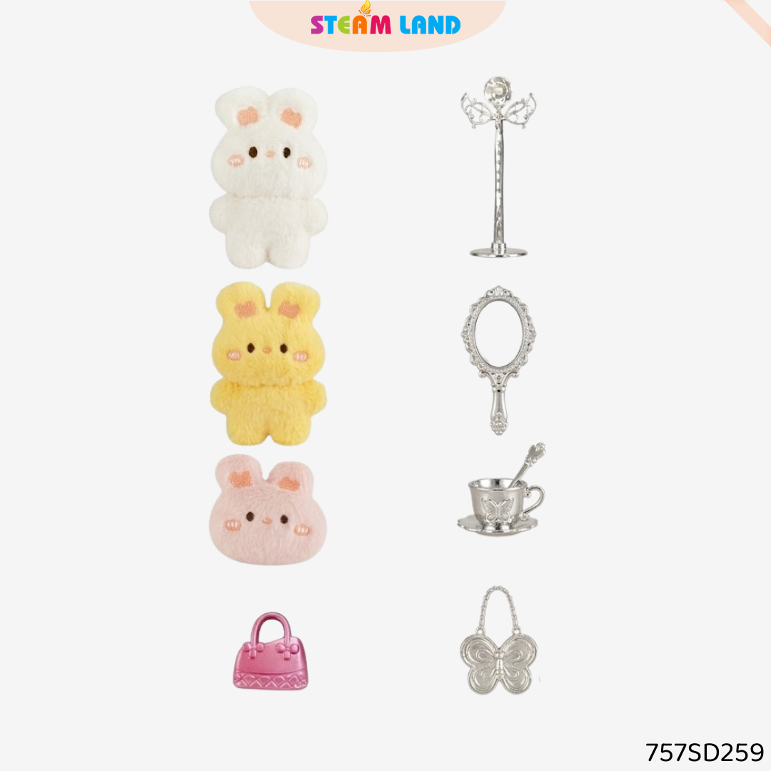 Bộ phụ kiện phong phú gồm túi xách, gương, trượng phép, cốc trà và nhiều món đồ nhỏ xinh giúp bé thỏa sức sáng tạo câu chuyện riêng.