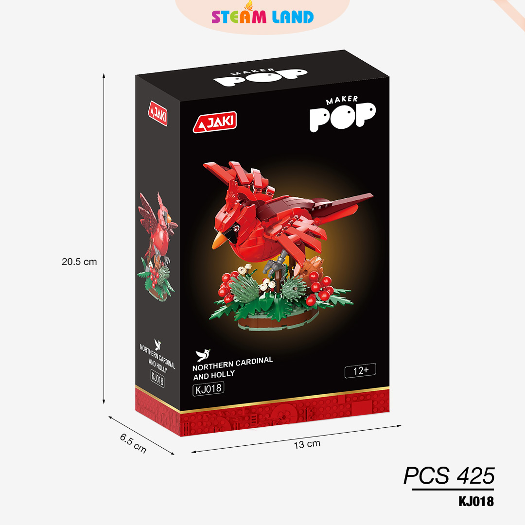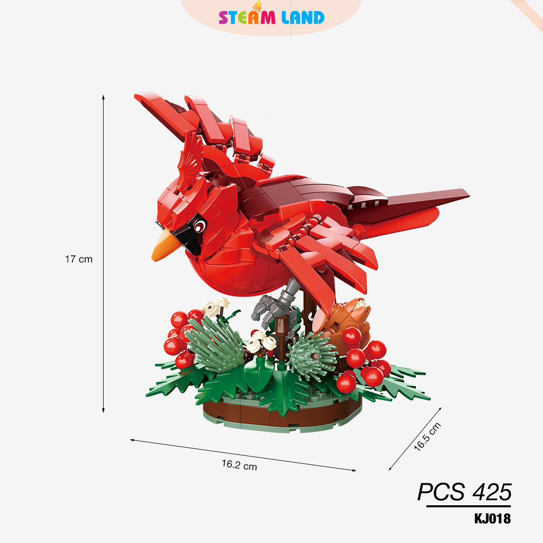 Mô hình lắp ráp JAKI-KJ018 chim hồng y Bắc Mỹ sở hữu thiết kế nổi bật trên nền lá và quả đỏ, kết hợp trưng bày cùng hộp hoa trang trí giúp không gian thêm sinh động và bắt mắt.