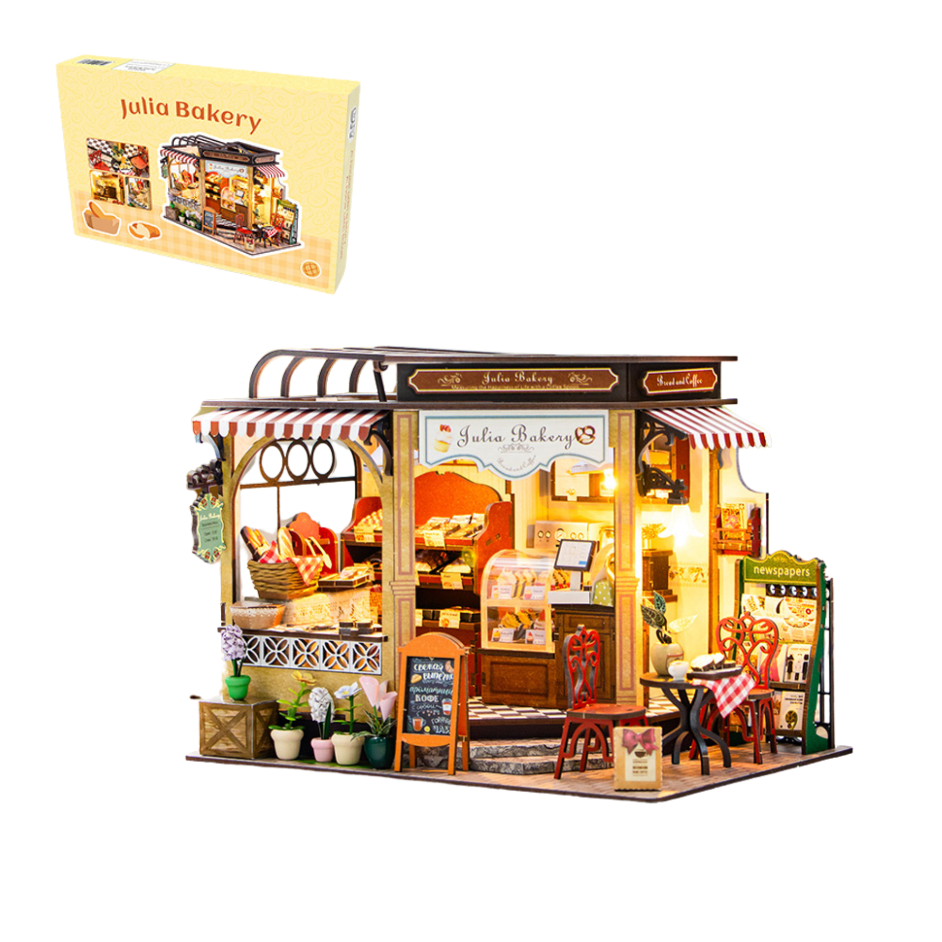 HONGDA-M2422Z – bộ lắp ráp DIY “Tiệm Bánh Ngọt của Julia” với tông màu ngọt ngào, thiết kế chi tiết và ánh đèn LED lung linh. Sản phẩm kèm hộp mica chống bụi, lý tưởng để décor không gian sống