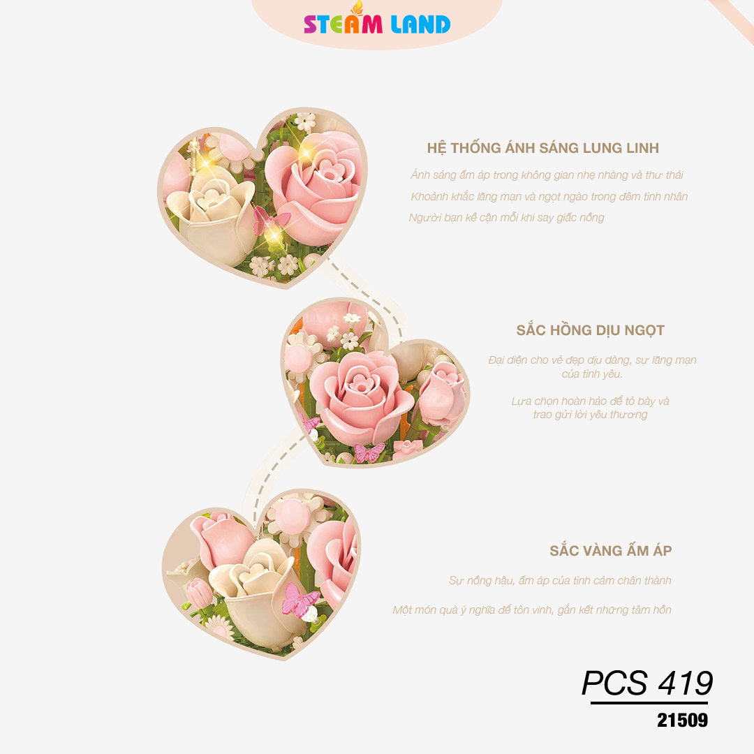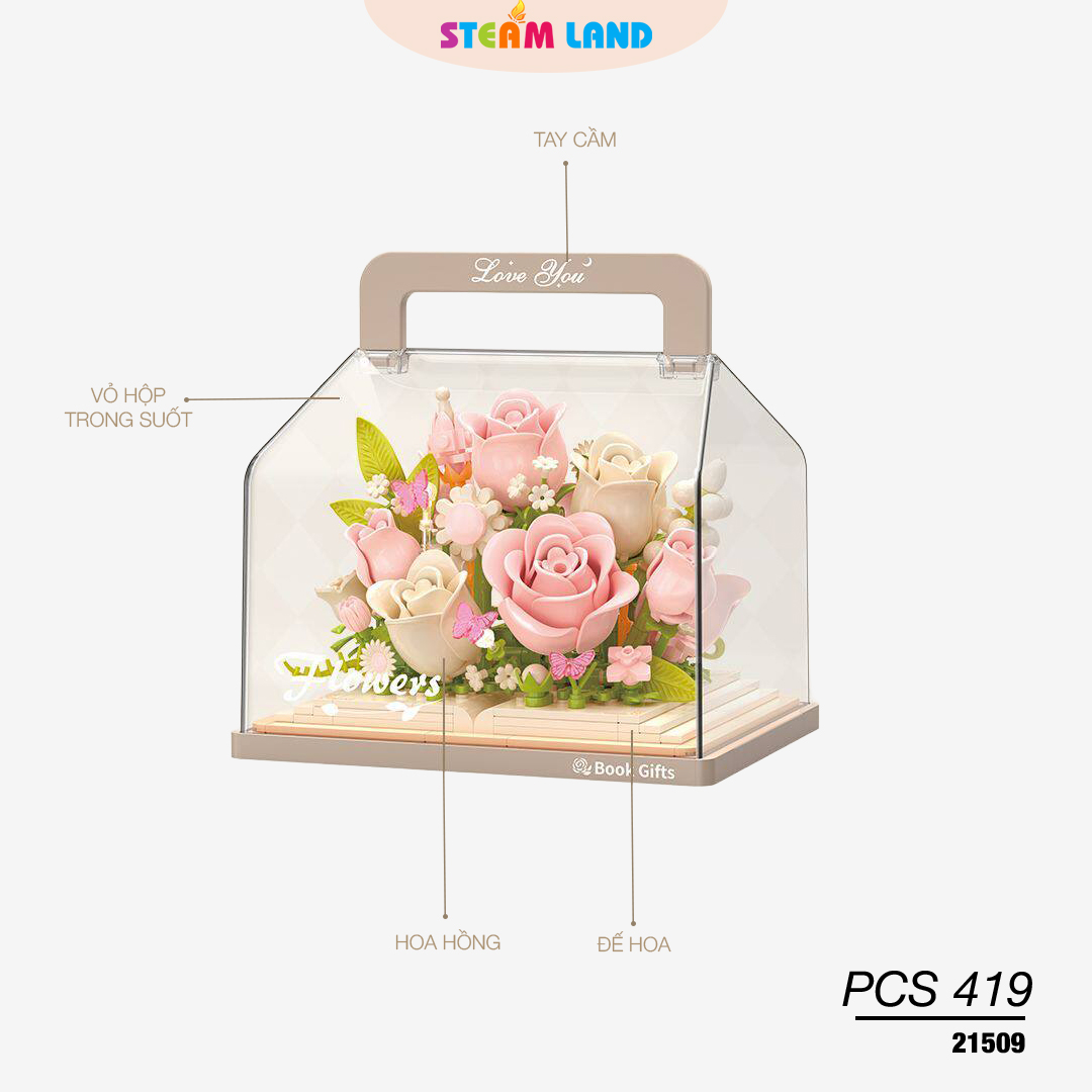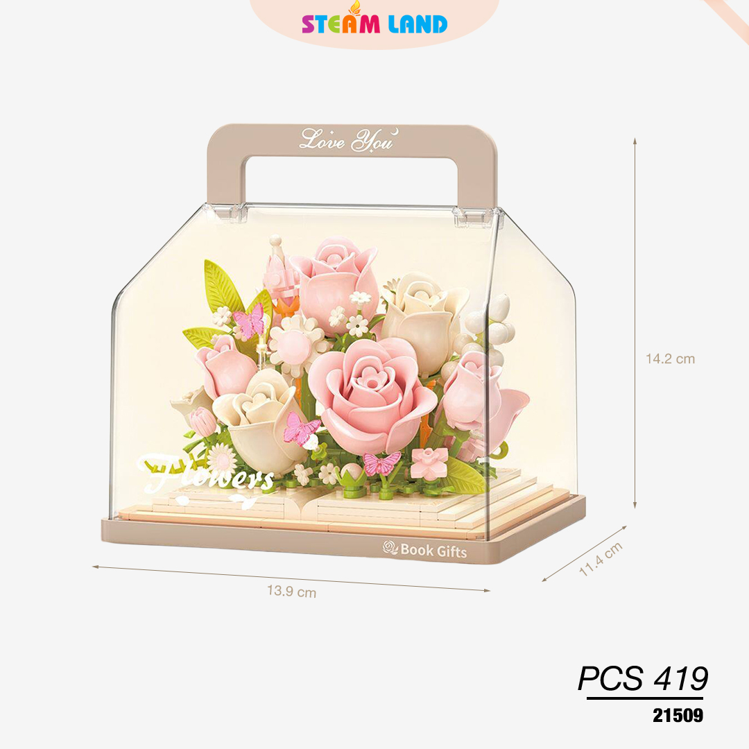 Mô hình hộp hoa lắp ráp BALODY-21509 với 419 chi tiết tinh xảo, thiết kế hoa hồng ngọt ngào kết hợp ánh sáng lung linh, thích hợp trang trí không gian và làm quà tặng ý nghĩa.