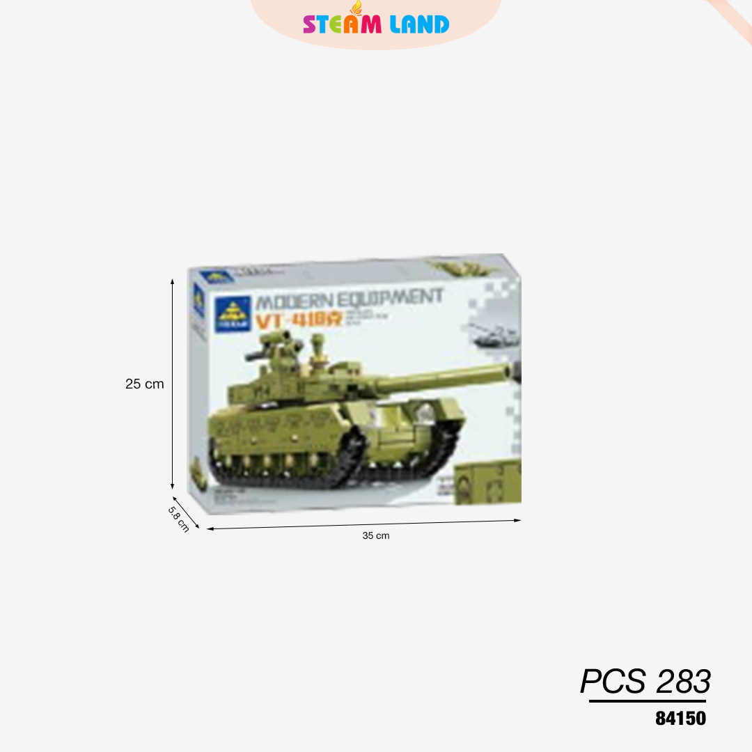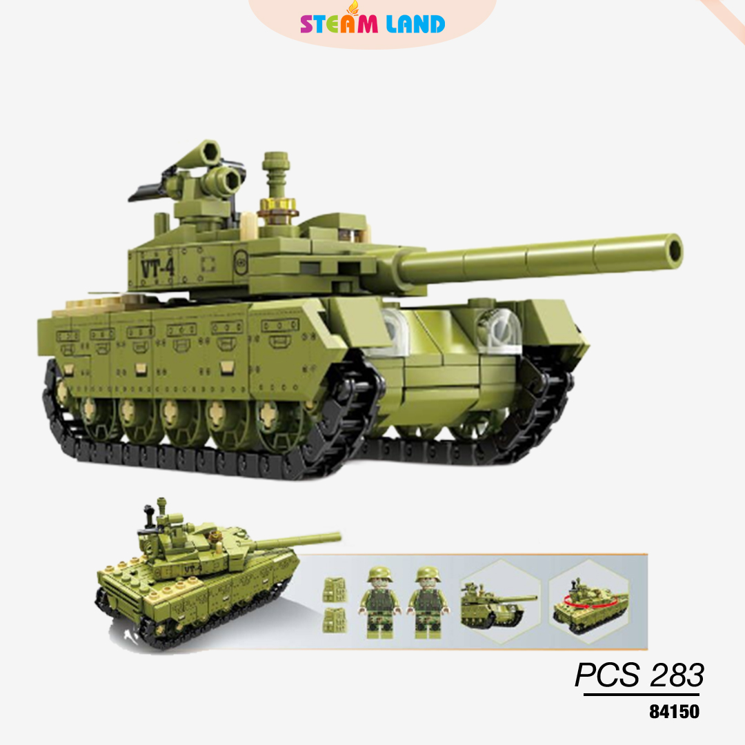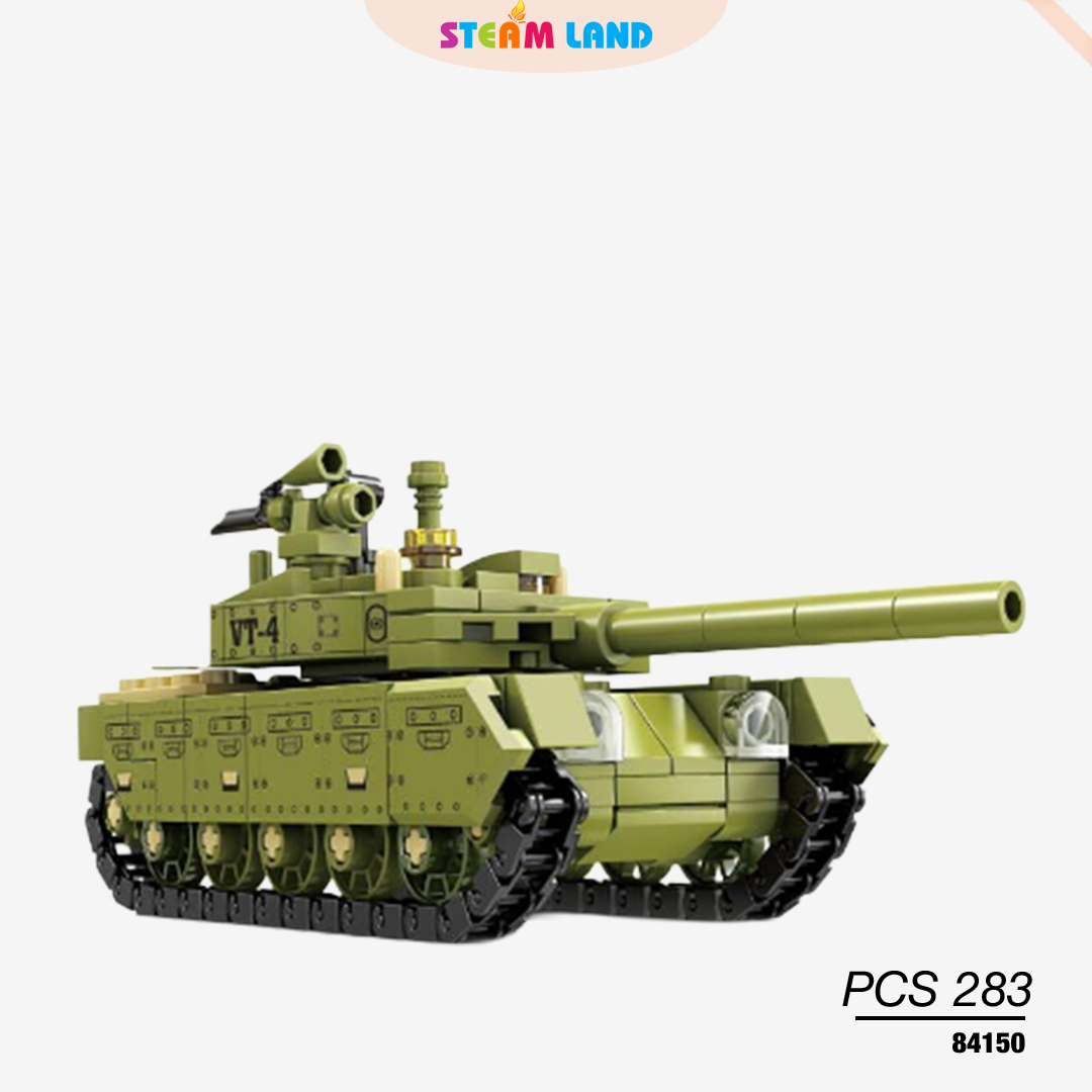 KAZI-84150 mang đến trải nghiệm lắp ráp xe tăng VT-4 cực ngầu với hơn 280 mảnh ghép, tháp pháo xoay linh hoạt, bánh xích chân thật kèm lính mô hình cực chiến.