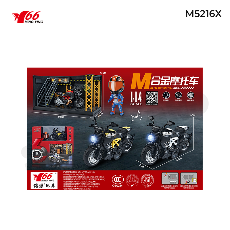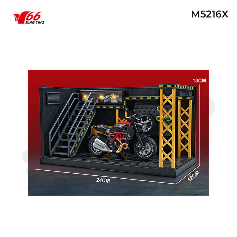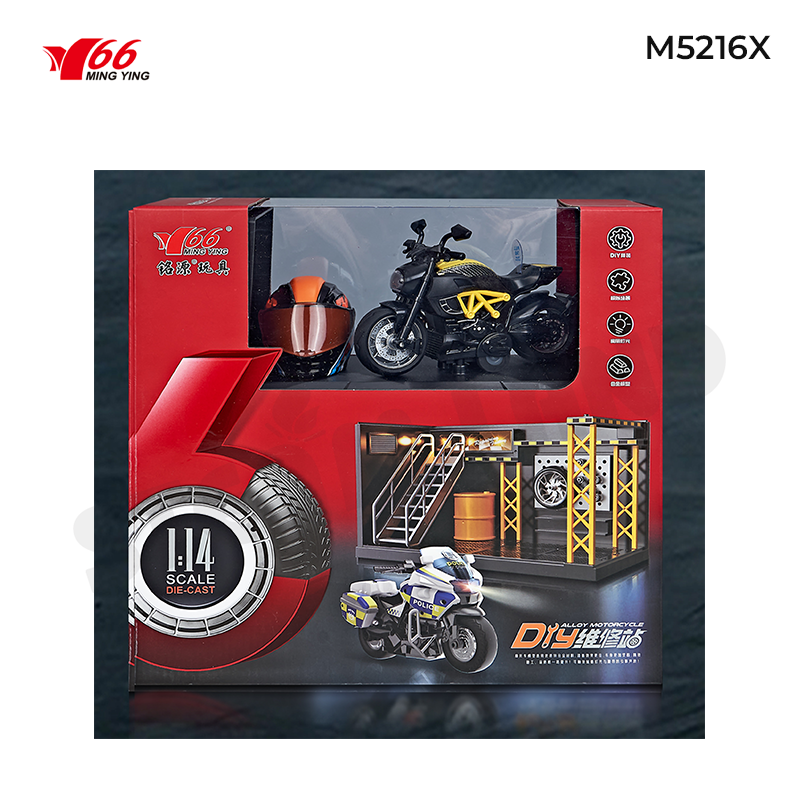 Mô tô hợp kim tỷ lệ 1:14 mầu trắng + Décor gara sửa chữa - MY66-M5216X-W là sự kết hợp hoàn hảo giữa nghệ thuật và kỹ thuật.