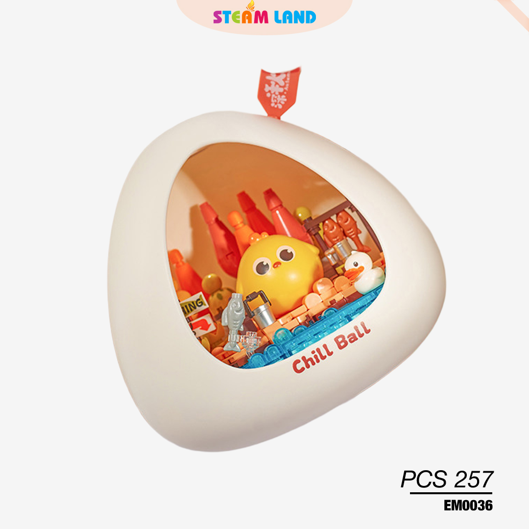 Mô hình lắp ráp mini với chủ đề gà con câu cá, tạo hình nhân vật tròn xinh, biểu cảm sinh động và đáng yêu