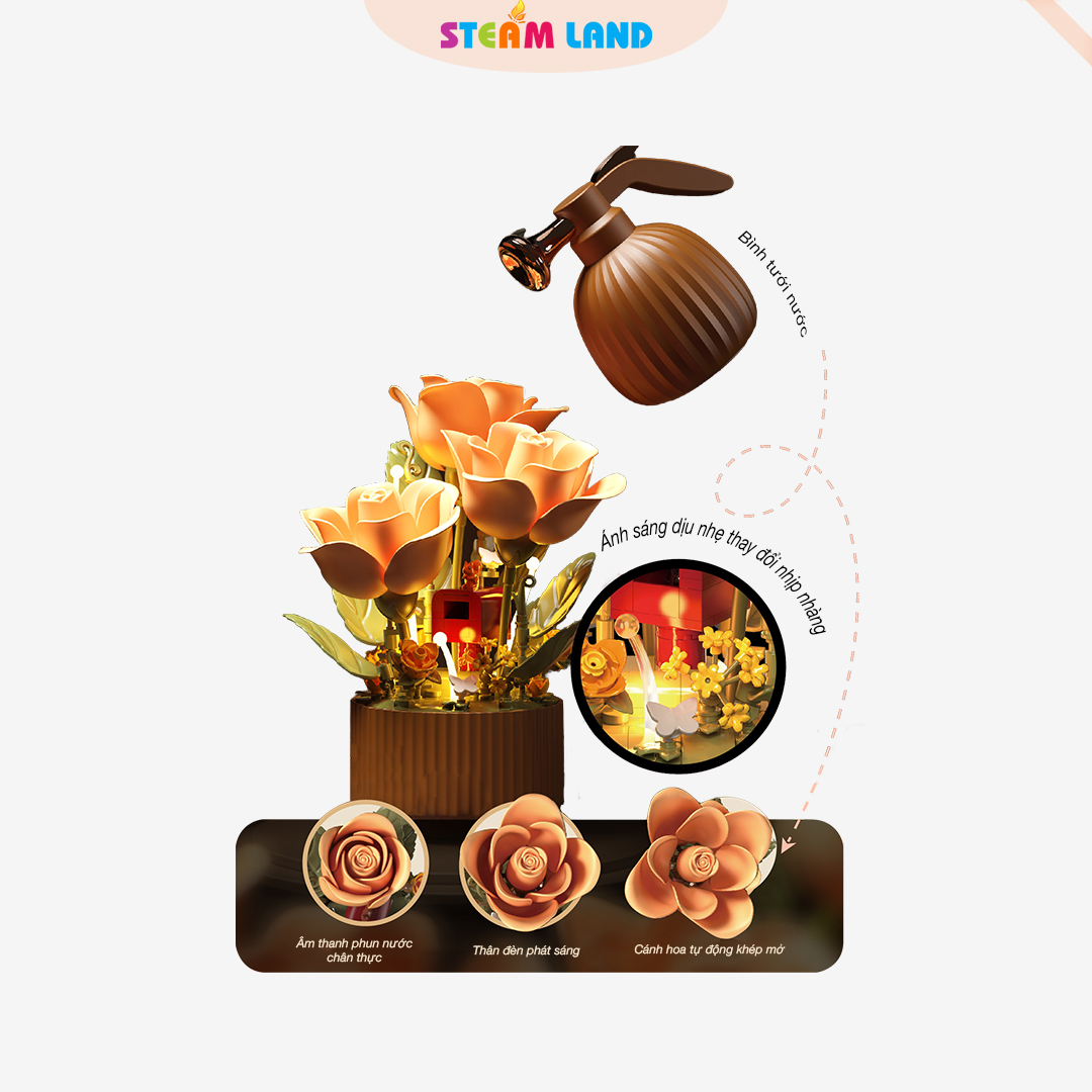 Phát âm thanh phun nước, cánh hoa tự động khép mở, thân hoa phát sáng